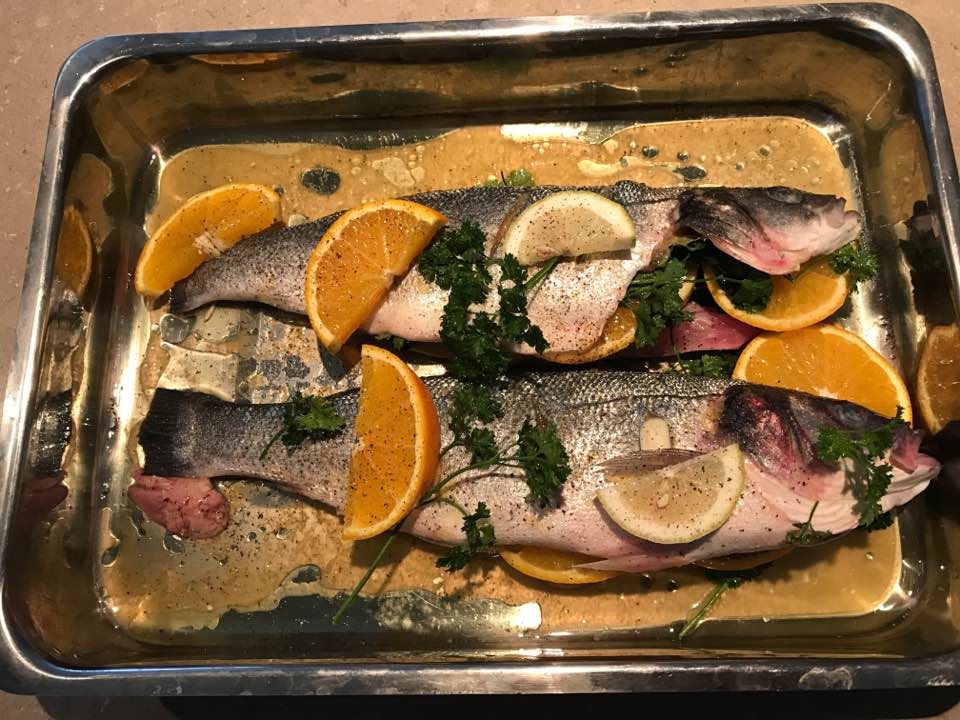 6 Fileer de zeebaarzen voor het opdienen, of laat ze heel. Leg ze op de borden en giet de saus uit de ovenschaal erover. Garneer met de overgebleven plakken sinaasappel en citroen.